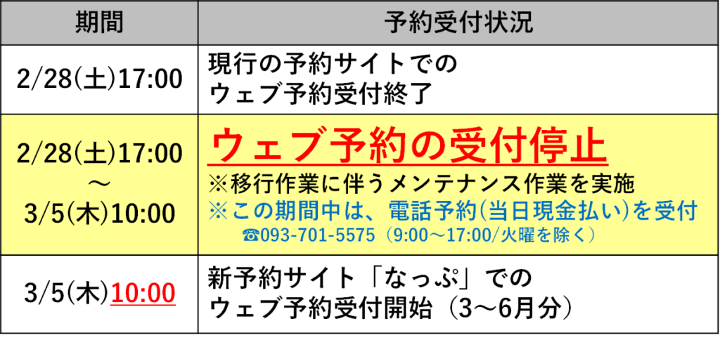 ■ 予約サイト切替に伴うウェブ予約の一時停止(2/28(土)17:00~3/5(木)10:00)