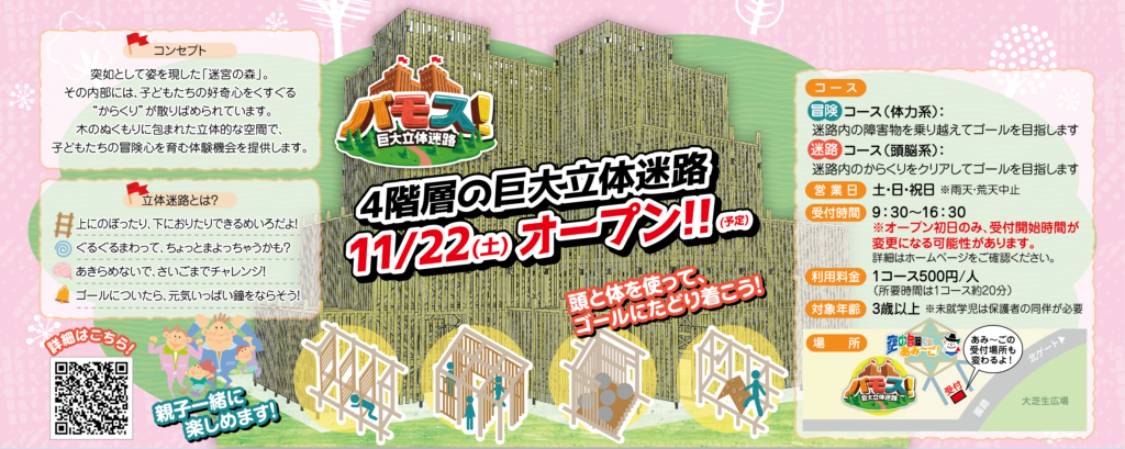 - セレモニー参加者限定(11/22(土)9:30から)で、オープン前に「巨大立体迷路・バモス」を無料で挑戦できます。 ※通常は1人500円
