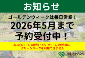 いつもHIBIKINADA CAMP BASEをご利用いただきありがとうございます。当キャンプ場は以下の通り2日間がお休みとなります。 2024年はグリーンパーク同様1月2日(火)より営業スタートとなります!来年もどうぞ […]